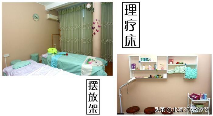 理疗床继续延续粉色墙面+绿色的温馨舒色调。这个房间有个硬伤就是柱子,它切割整个房间小办区域,但是还不能打掉,有点尴尬。怎么好呢?