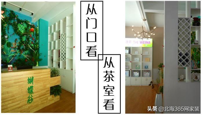 森林风的背景墙隔壁是起到阻隔视线和产品摆放的隔断柜。其实刚开始是没想到要做一个柜子的,某一天老板娘从门口进来,发现第一眼看到的居然是休憩间里那几个整个吃午餐的员工,瞬间觉得不雅观,于是就有这个能隔断视线又能储物的隔断柜。
