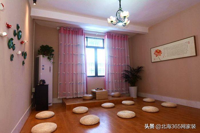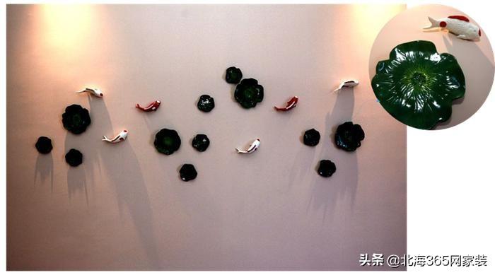浅粉色的背景墙被筒灯的衬托下,墙上的荷叶和金鱼更加立体有质感。这是当下很流行的墙面装饰--挂盘子装饰。当然你们也别担心掉下来的问题,挂件下是做了很牢固的处理的。