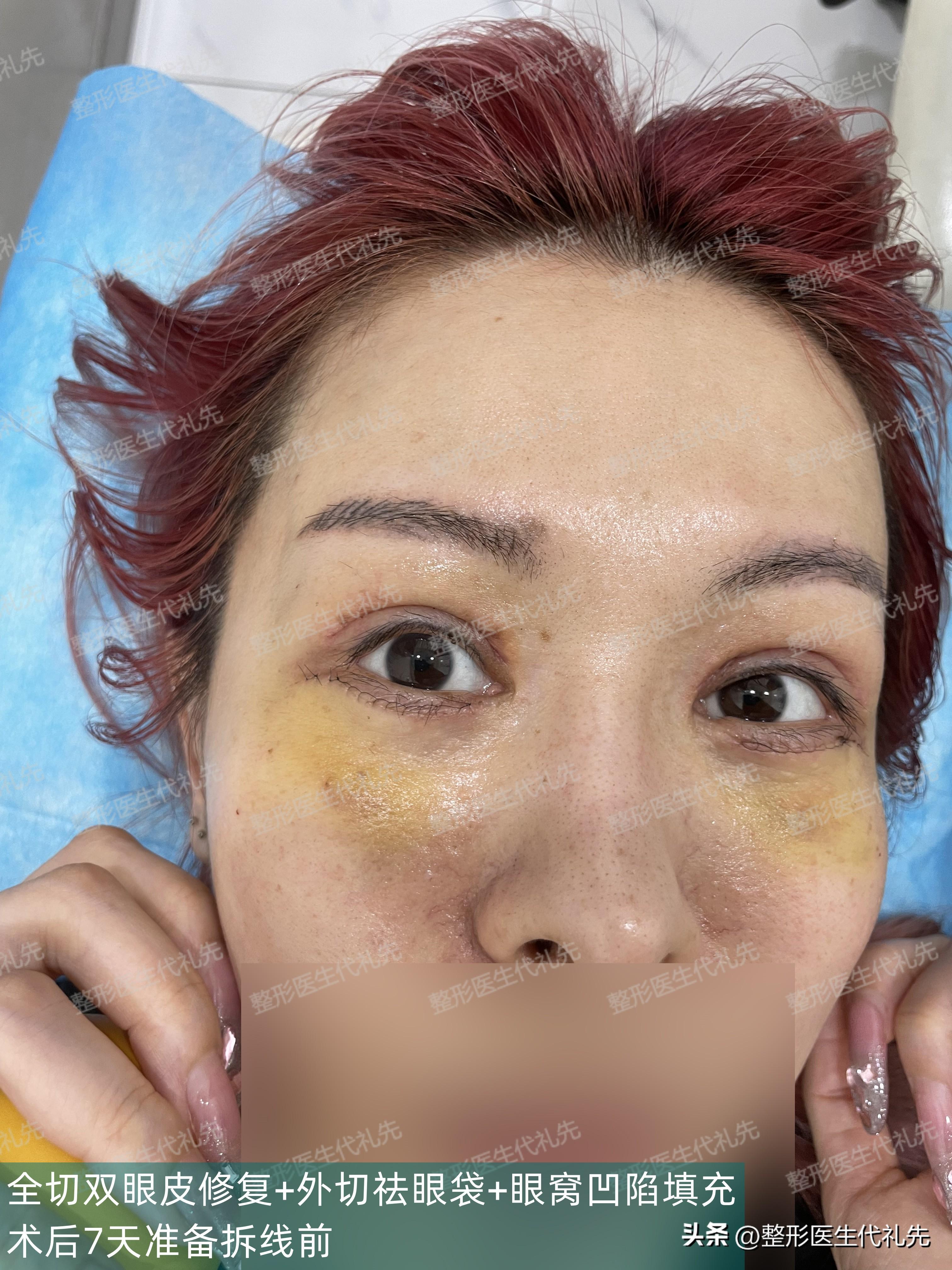 全切双眼皮修复+外切祛眼袋+眼周凹陷填充术后7天准备拆线