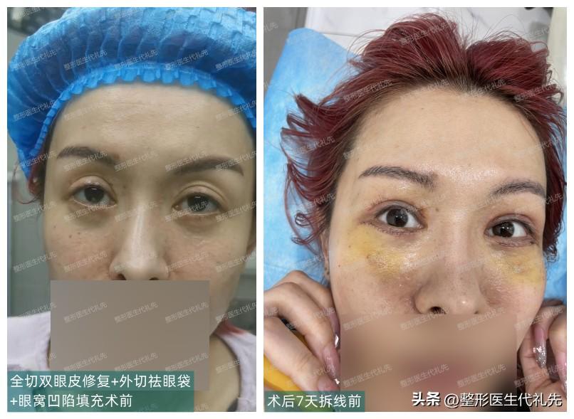 全切双眼皮修复+外切祛眼袋+眼周凹陷填充术后7天准备拆线与术前对比