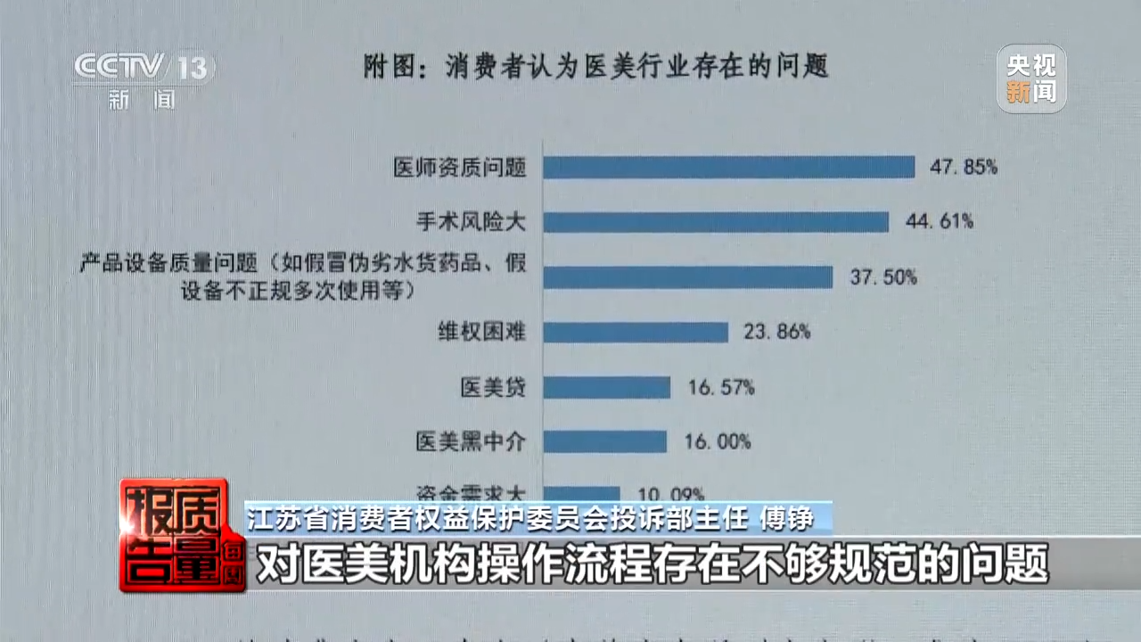 江苏省消费者权益保护委员会投诉部主任 傅铮:在网络舆情中有多名消费者反馈,医美机构存在医生不具备资质、实际动刀医生与手术单签字医生不符的问题。此外,问卷调查中,对于医美机构操作流程存在不够规范的问题,有50.14%的消费者认为医美机构进行医疗美容项目前风险告知不够完善。
