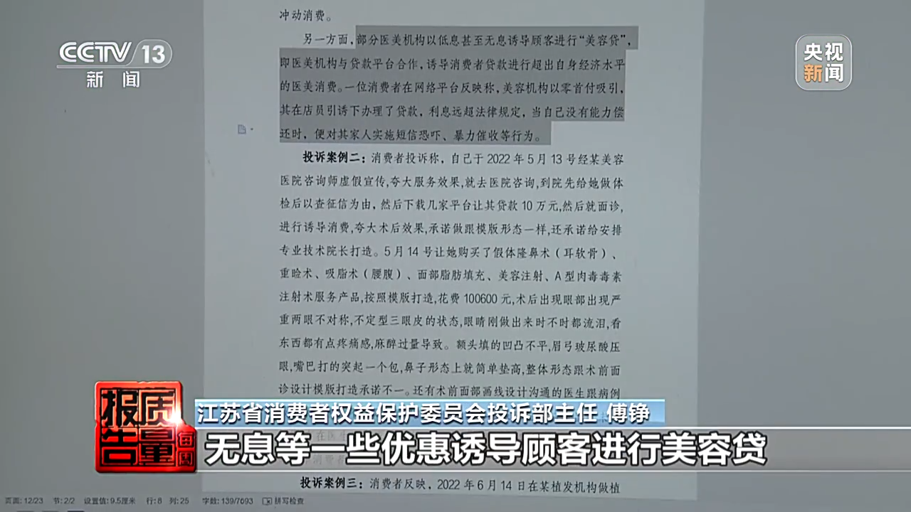 江苏省消费者权益保护委员会投诉部主任 傅铮:消费者反馈,医美机构利用修图后的照片,制造虚假案例对医美果进行夸大宣传。部分医美机构将非医疗器械的一般产品宣传成具有医疗功的产品,使公众误解其产品有一定调节作用。还有部分机构为了获得客流量,利用社交媒体平台夸大美容果、虚假分享个人经历。甚至还有医美机构以低息、无息等一些优惠诱导顾客进行“美容贷”,高额的利息导致消费者终遭遇恐吓、暴力催收等困境。