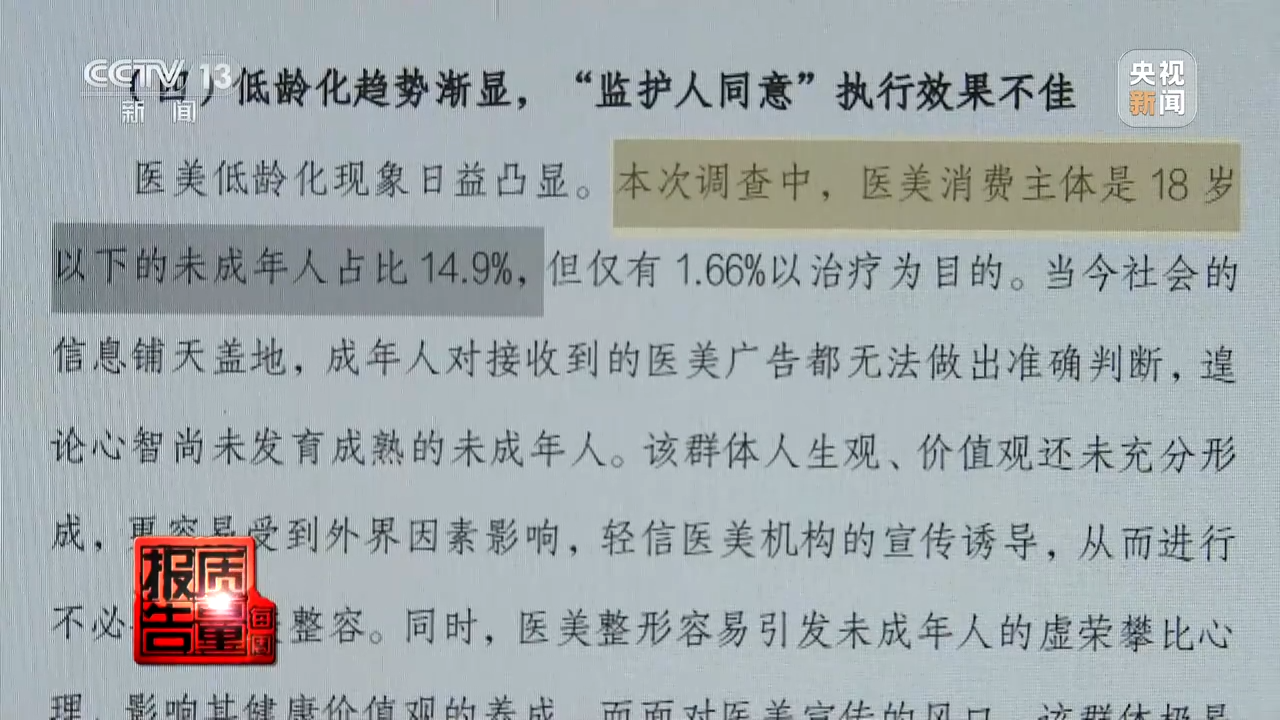 江苏省消费者权益保护委员会副秘书长 居上:对此相关法律针对未成年人医美做出规定,“执业医师对就医者实施调节前,必须向就医者本人或亲属书面告知调节的适应症、禁忌症、医疗风险和注意事项等,并取得就医者本人或监护人的签字同意。”但实际实施中,父母不到场,未成年人只需带上户口本或者录音等资料,即可认定为“监护人同意”,使得“监护人同意”条款流于形式。