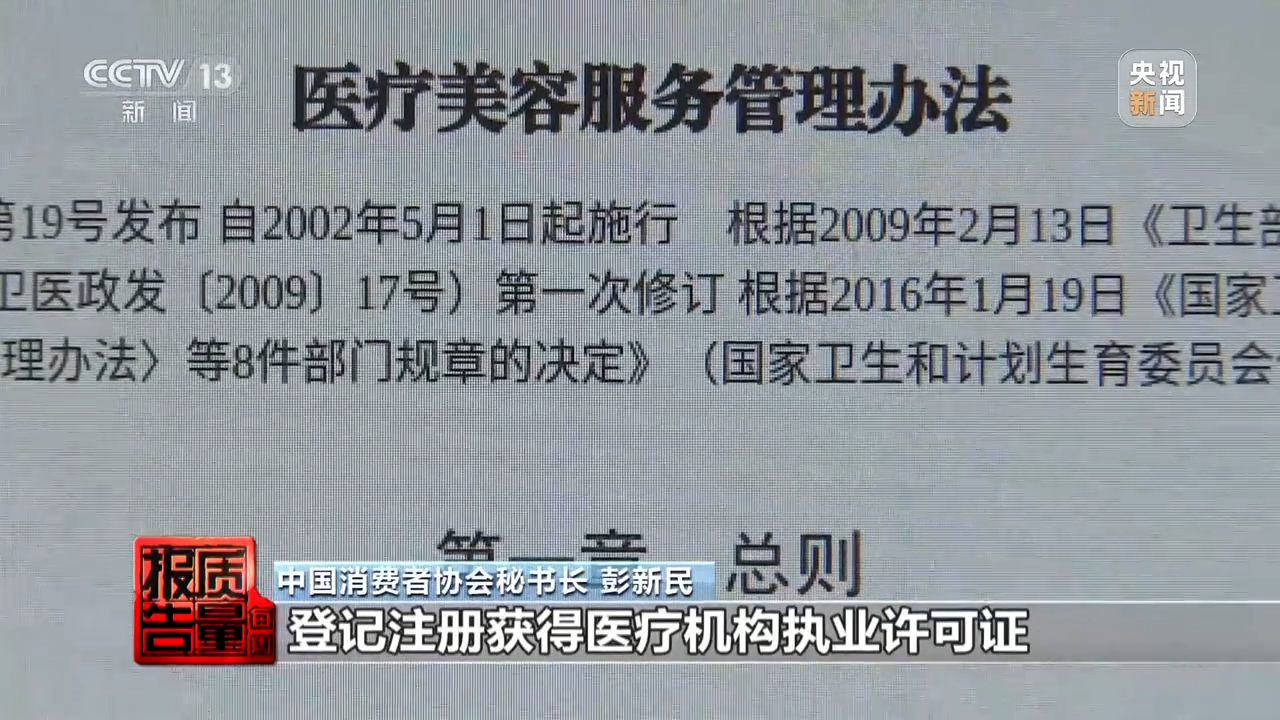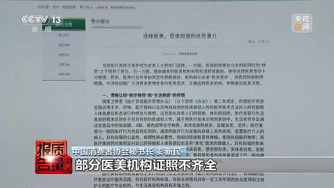 中国消费者协会秘书长 彭新民:存在的主要问题有:部分医美机构证照不齐全,未取得医美经营许可或超范围经营;一些医美从业人员不具备执业资格,操作不规范;一些医疗产品进货渠道不明,部分医美机构使用假货、水货针剂以及山寨设备等;医美果难以评估,服务质量与消费者预期仍有较大差距。