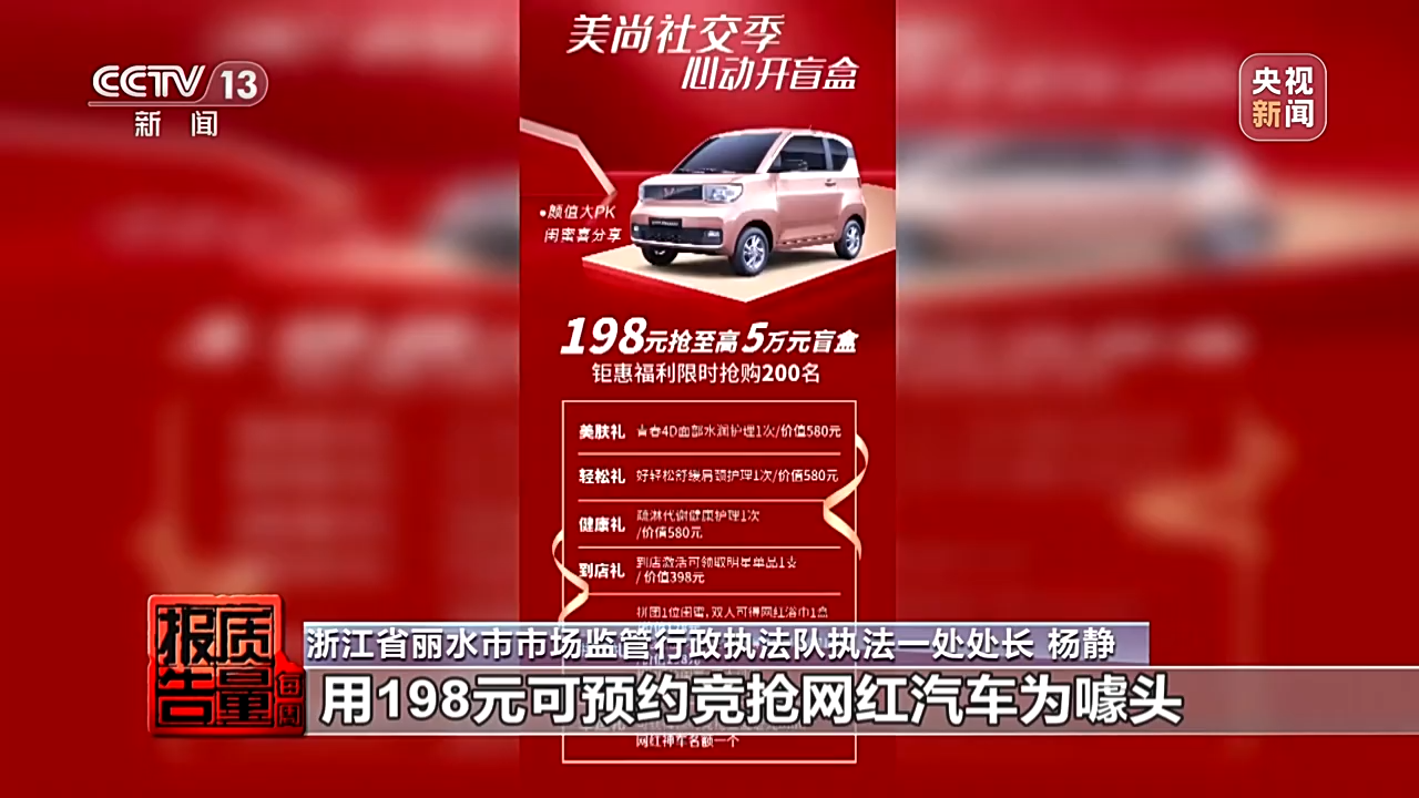 浙江省丽水市市场监管行政执法队执法一处处长 杨静:用198元可预约竞抢网红汽车为噱头,吸引顾客带朋友组团购买,消费者要花2980元才能参与第二阶段活动,并且参加活动的消费者数量需超过120人,这个美容机构才会举行网红汽车抽奖活动。但是像这些抽奖条件,开奖时间,奖品数量等内容,应该在活动刚开始就明确公布的,该美容院都没有对外公布,影响兑奖。消费者是被美容机构一步一步带入他们设置的圈套当中。