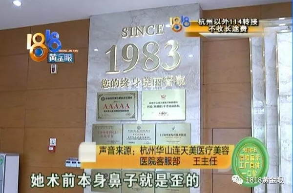 杭州华山连天美医疗美容医院客服部 王主任:“关于患者自己的认知,我们持保留的意见,现在她说的手术失败,歪了,做毁容了,不是她说了算,也不是我们说了算,我们有专门的机构做专门的鉴定,我们并没说给她做歪了,她本身鼻子就是歪的,她是在我们这做的修复的手术。”