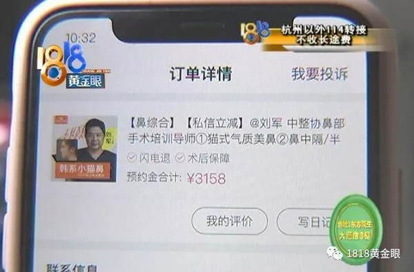 孙女士是辽宁人,她说之前做过鼻子整形,把以前的假体拿出六个月后,打算做修复。6月中旬,她在新氧APP上预定了杭州华山连天美整形医院的手术,在软件上缴纳了24800块钱。7月初,做了手术,又交了8000块钱左右。