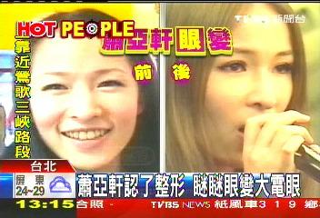 据台湾媒体报道,萧亚轩眼睛变大了!根据媒体报导,她承认有动刀,因为已经过世的妈妈生前希望,女儿有双闪亮电眼,萧亚轩在眼睛的头、中、尾,各缝了一针,花了1万5千。经过一个星期的休养,她的眼睛变大,现在出门画妆不用再花上2个小时,充满自信心。