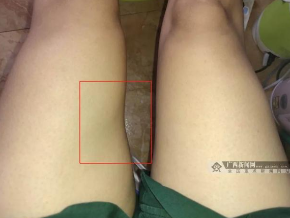 小玲左大腿中段位置出现凹陷