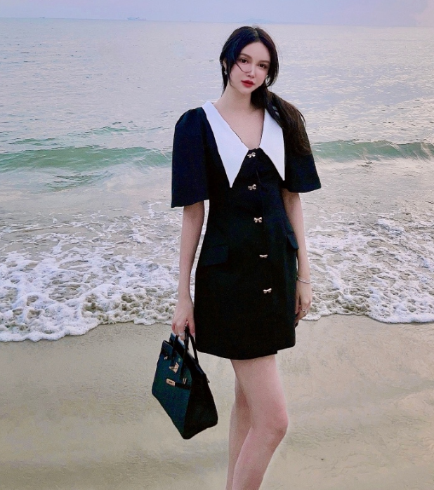 在她所穿的这身长裙中,出现的白色“蝴蝶领”设计还让自己的造型看着更具小香风气息,而且这种打扮下的她配上自己身具的环境后才显得有意境。