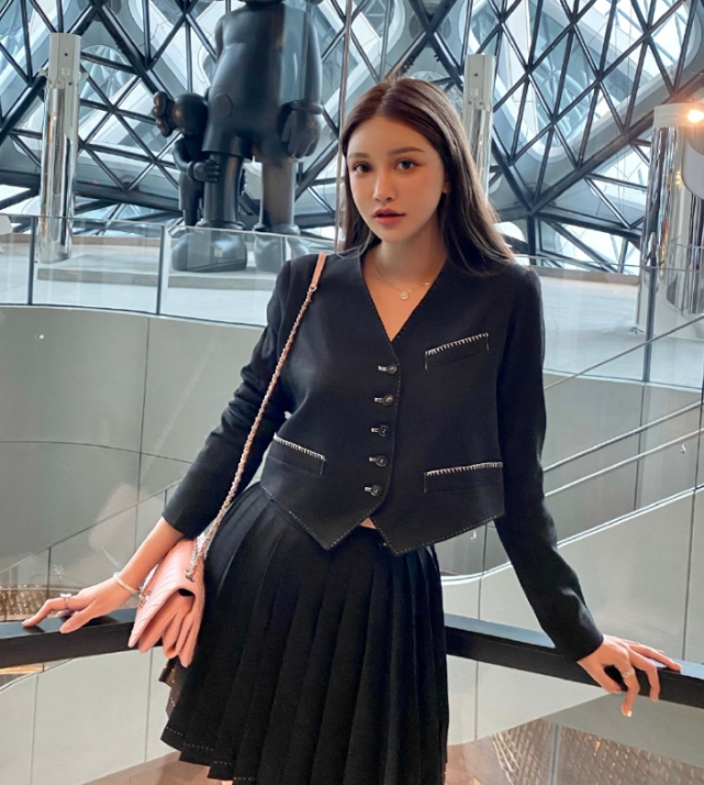 中性打扮成酷炫女强人跟在网络中走红的各种女网红一样,生活中吴晓辰的形象也是多变的,这种中性打扮下的她就让我们get到她身具的酷气感。整身全黑套装裙的出现是将吴晓辰变得极度成熟,加上她所留的这顶无刘海长发也将自己显得更具摩登感,在小优看来这种造型下的吴晓辰完全就是一位女强人。