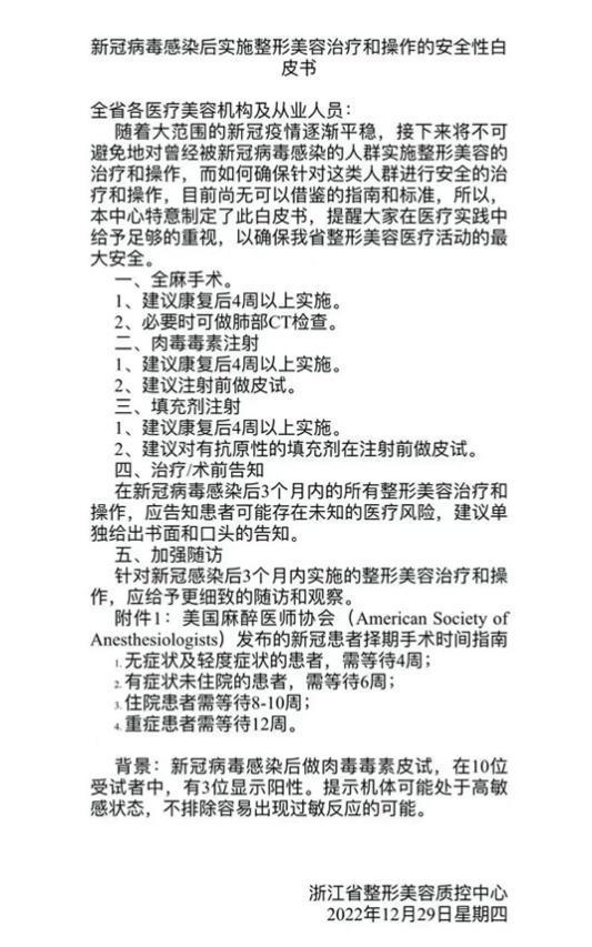 12月30日,一则落款为“浙江省整形美容质控中心”的《新冠病毒感染后实施整形美容调节和操作的性白皮书》流传,其中提到了新冠康复后,机体可能存在高敏感状态,需要等4周才建议做全麻手术、填充注射等相关调节。