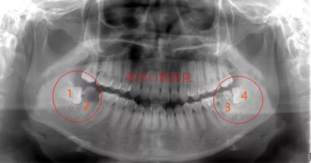 常规方案是患者左右下颌都有两颗横位阻生的智齿,没有及时拔除,现在这两颗智齿引起前面7号牙的严重龋坏,按常规调节方案需要拔除两颗智齿,以及智齿前方的两颗7号牙,一共要拔除四颗牙齿,然后再种植两颗牙。
