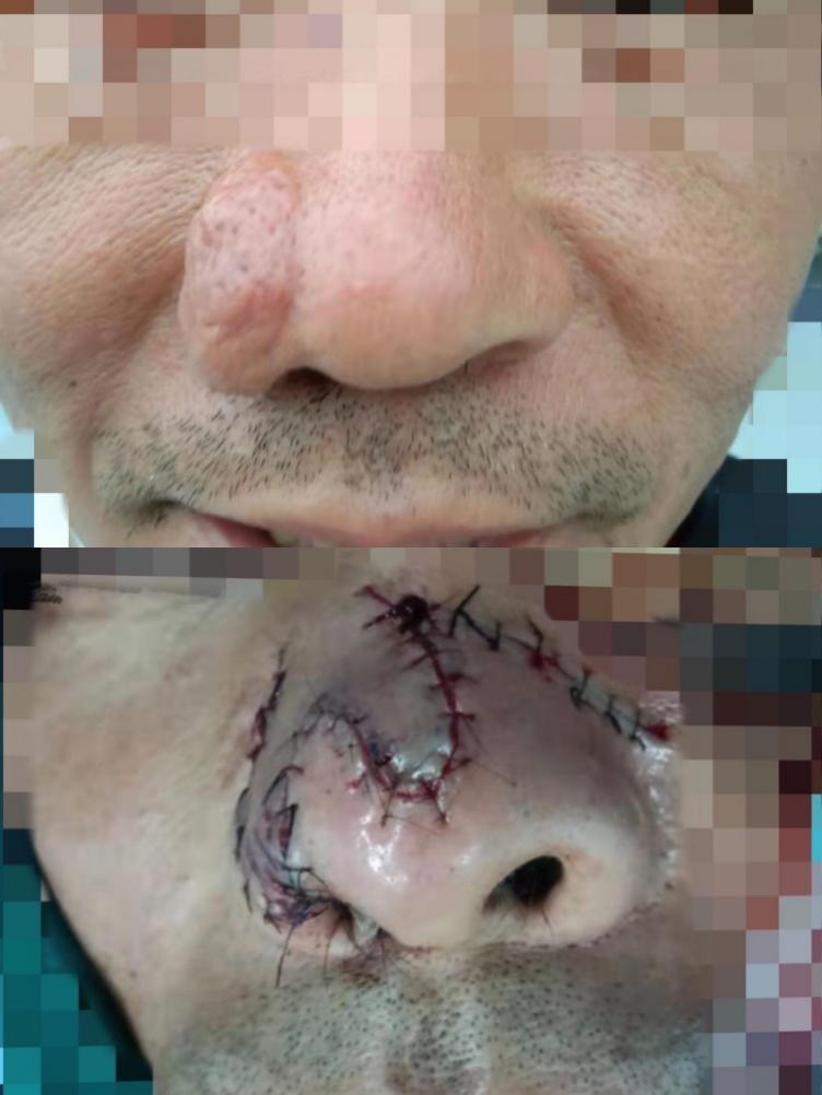 患者于10年前无诱因出现右侧鼻翼肿物,大小约4×3cm大小,影响外观。术中右侧鼻部肿物切除,双叶皮瓣转移修复。术后恢复正常形态。