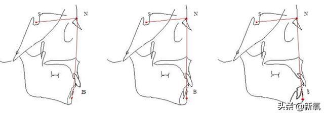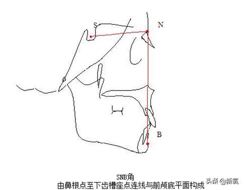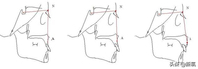 当SNA角过大时,上颌前突,侧面型就是典型的凸面型;当该角过小时,则是上颌后缩,侧面型呈凹面型。同理也能简单理解,当SNB角过大时,下颌相对前突,反之下颌后缩,但SNB角在生长过程中逐渐增大。