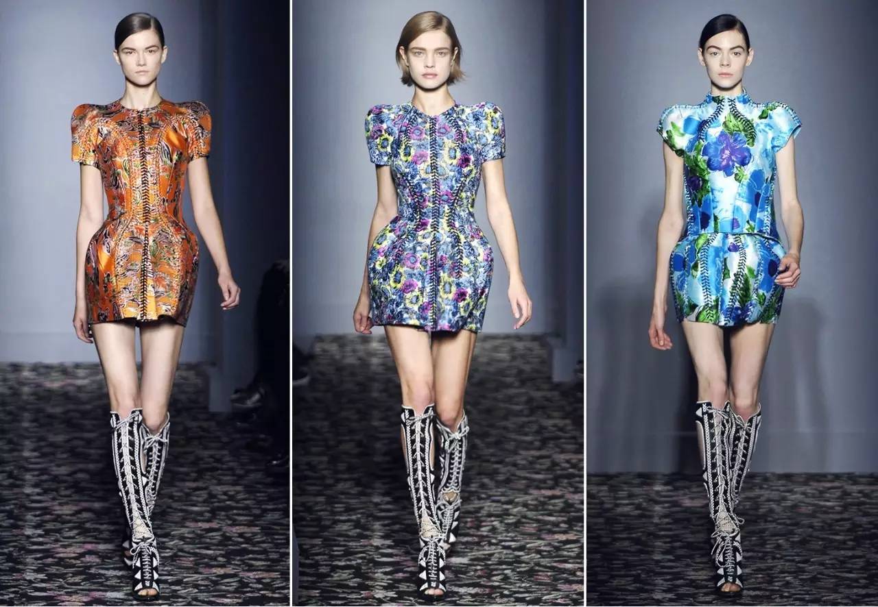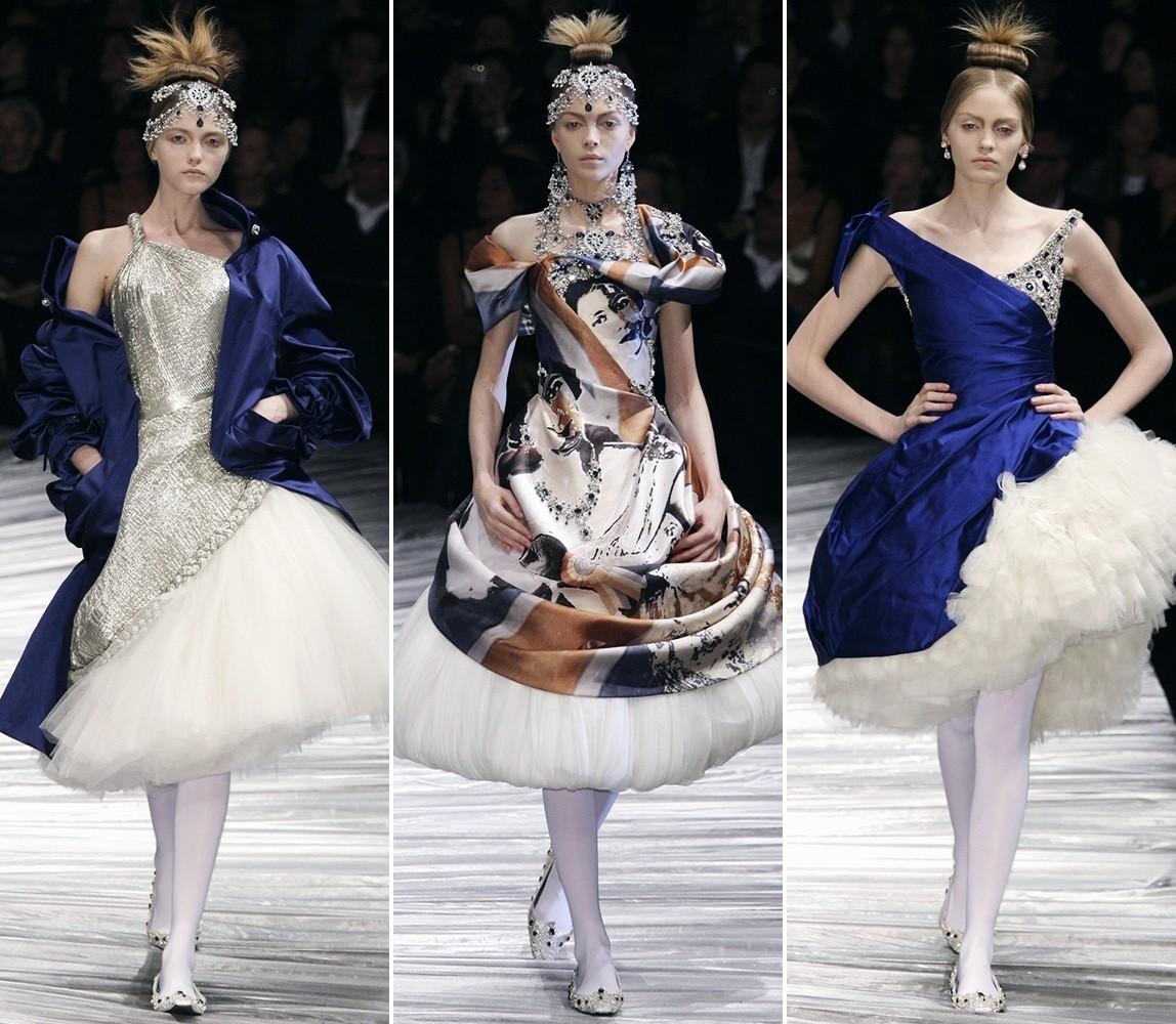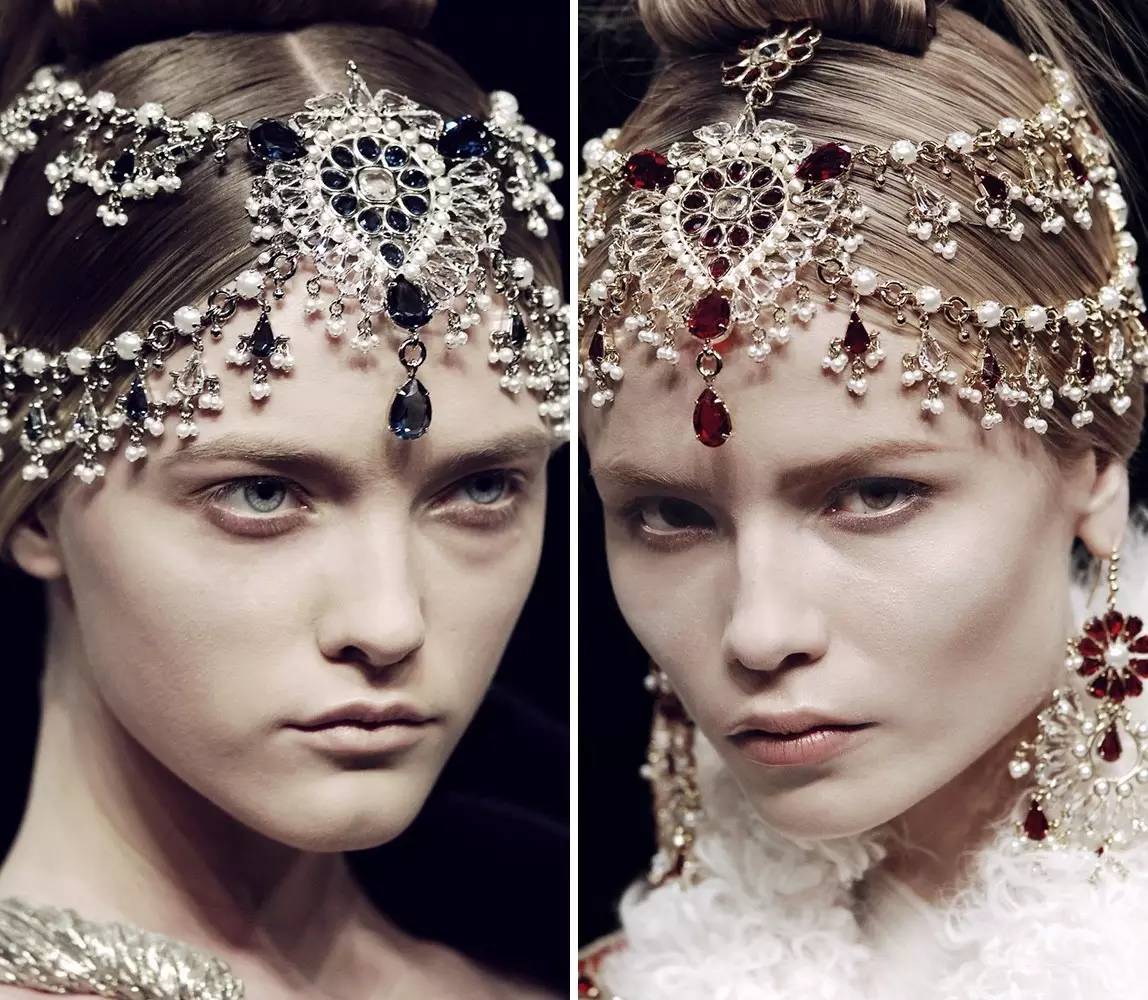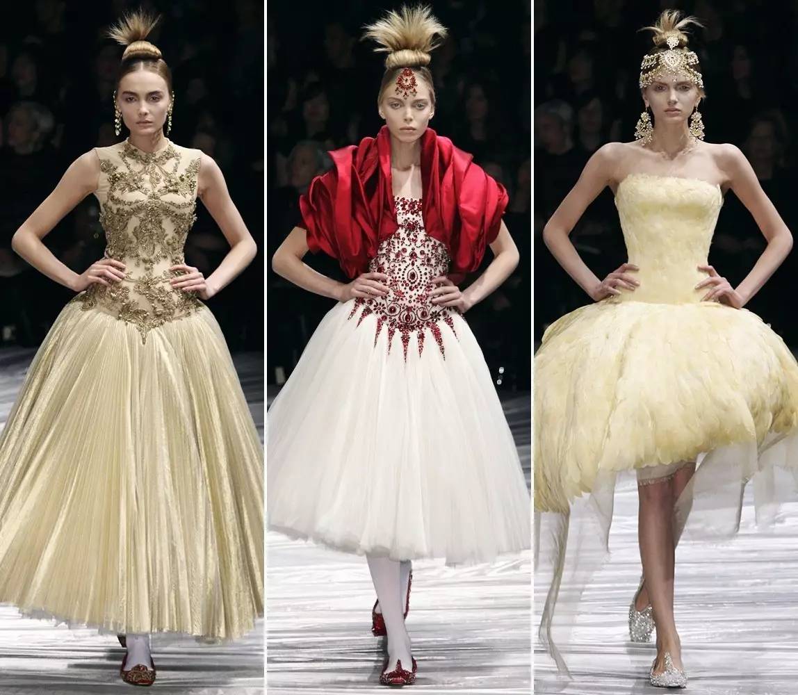 在这场后现代视觉系作品的盛宴上,McQueen还结合了此前他在印度游历的所见所闻,大量运用印度繁复的手工刺绣或是传统服饰与全新设计的相互糅合~