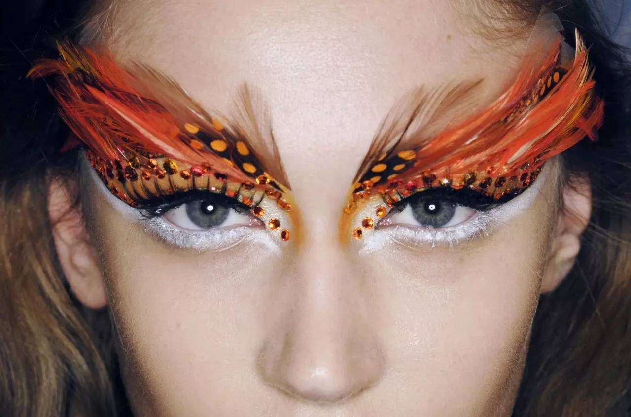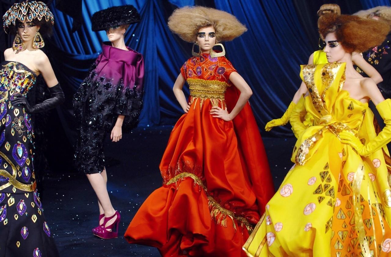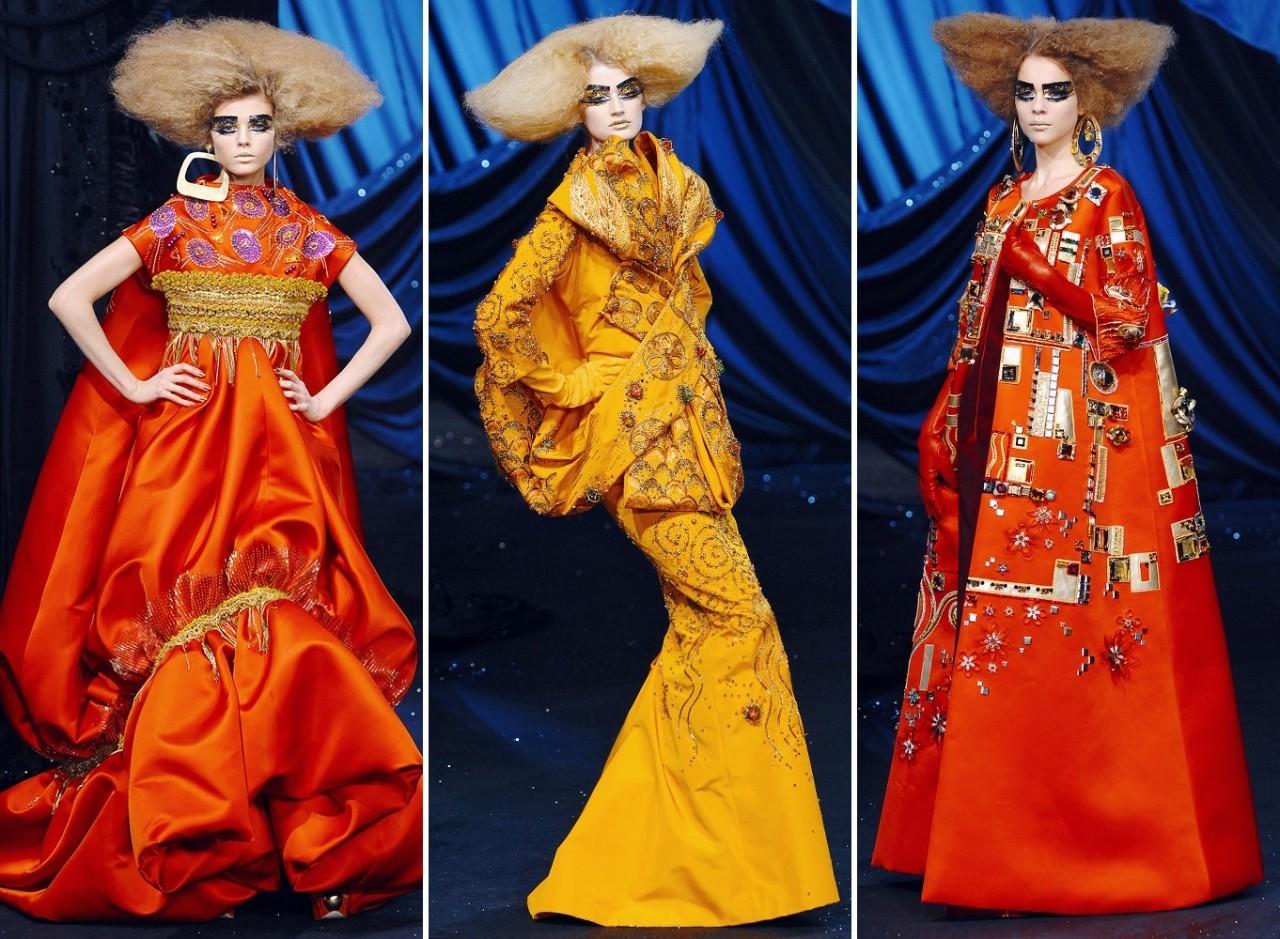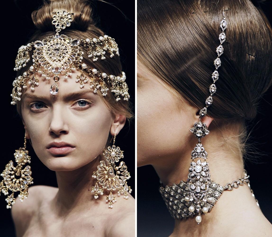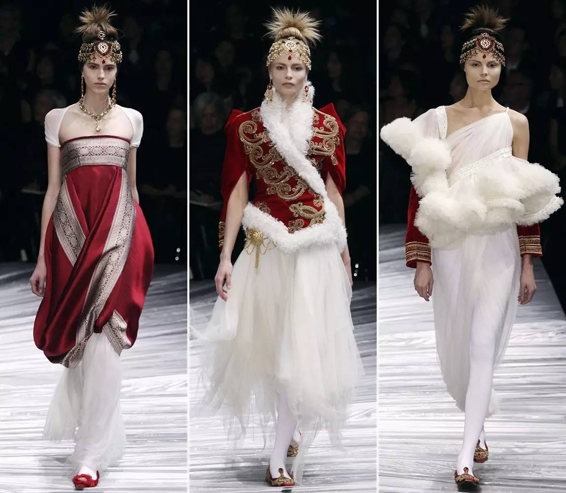 在这场后现代视觉系作品的盛宴上,McQueen还结合了此前他在印度游历的所见所闻,大量运用印度繁复的手工刺绣或是传统服饰与全新设计的相互糅合~