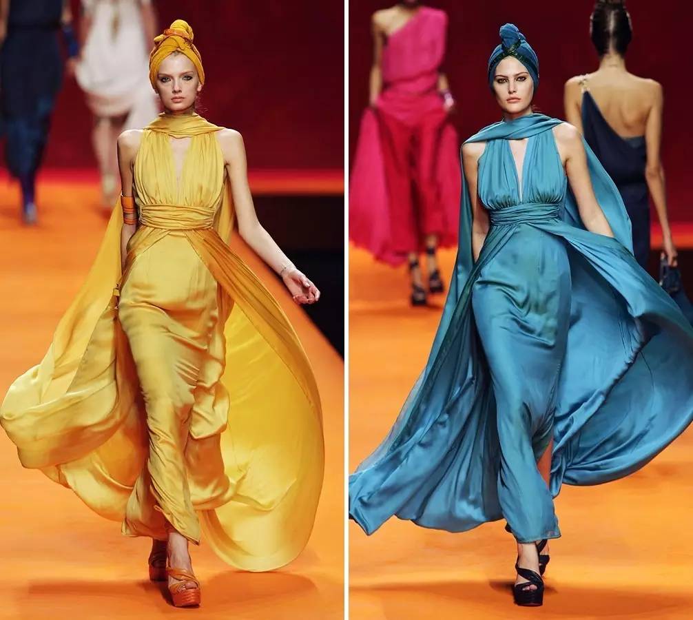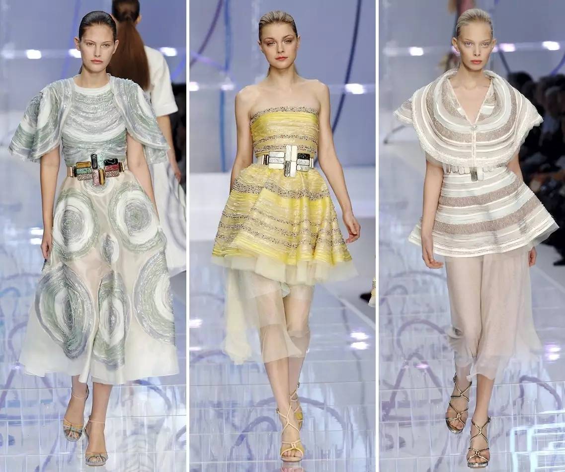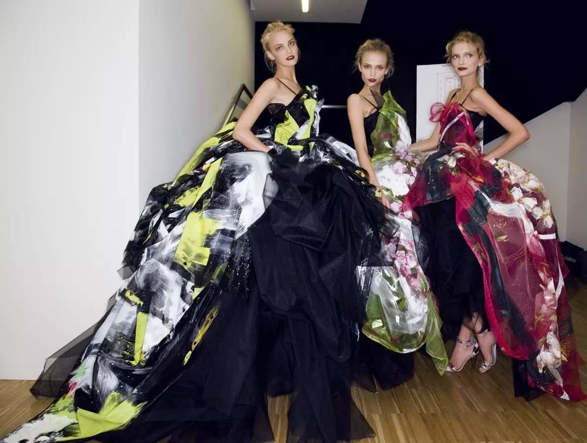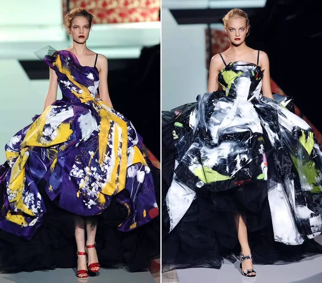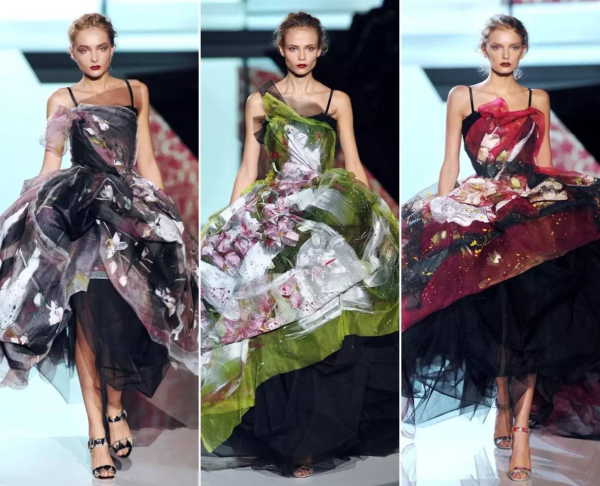 那一季的衣裙如同画布一样,起初的素净优雅逐渐转变为浓墨重彩的手绘泼墨,胸衣在优雅的直筒裙中若隐若现,外罩轻薄幔纱的各式礼服,无一不显华贵气质~