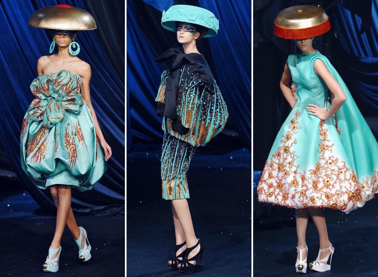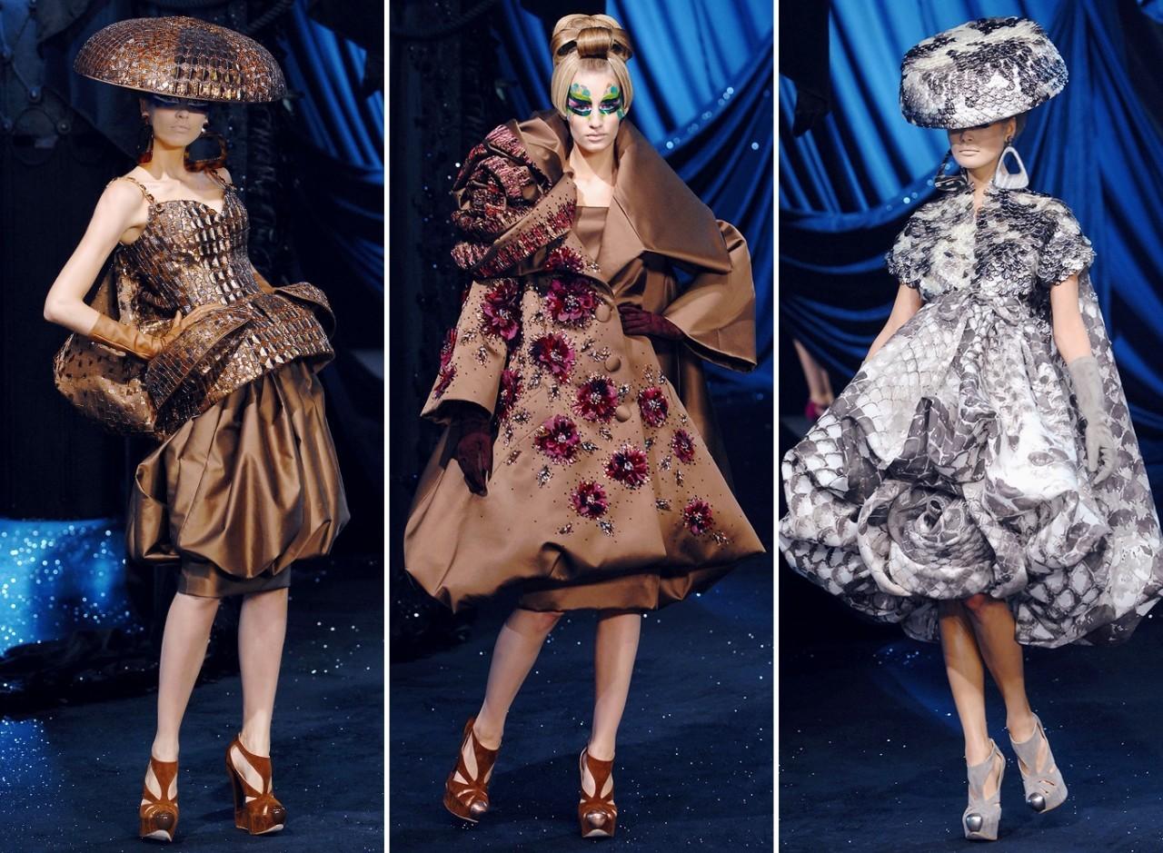 用摄人心魄的妖娆来形容这个系列再适合不过,服装的结构都是Galliano擅长的表现手法:沙漏型,扇形,有的被拉伸为优雅的鱼尾,有的腰身被塑形为鼓风状的铠甲~
