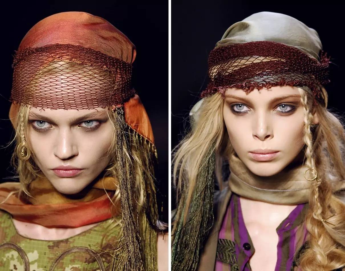 妆面以及帽饰的造型极尽所能的夸张着,但如果没有那些如同铁桶、锅盖的怪异头饰,没有那些缭绕成券拱、丝扣或布结一样的发鬓,服装的整体腔调会大打折扣。