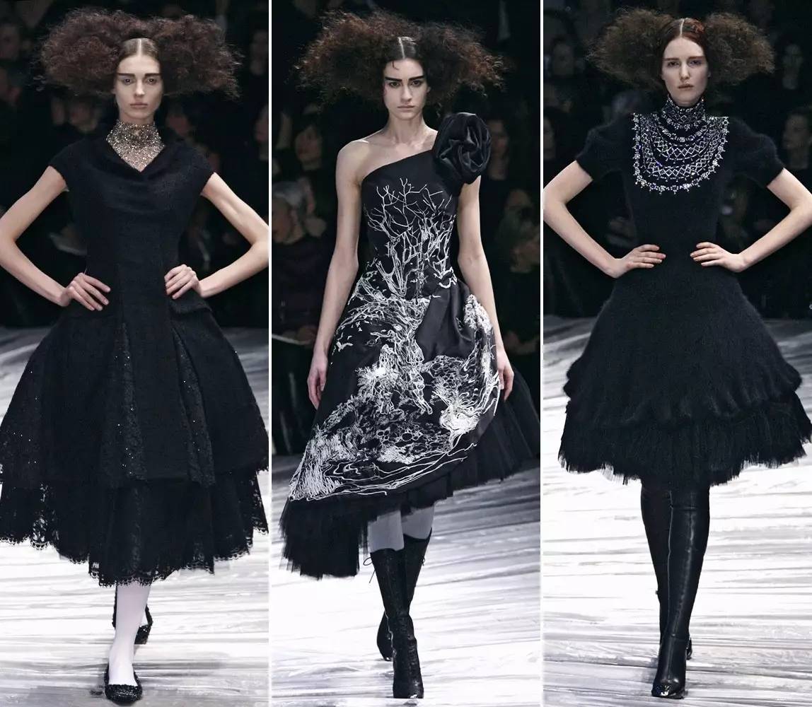 你会看到秀场上各种戏剧性的装饰装置,也会见到模特们从素净变为华美的全过程,McQueen用童话故事解释这个系列:女孩在前半场中身裹黑色素衣,当她遇见王子,从树上下来,摇身一变,成为高贵公主~