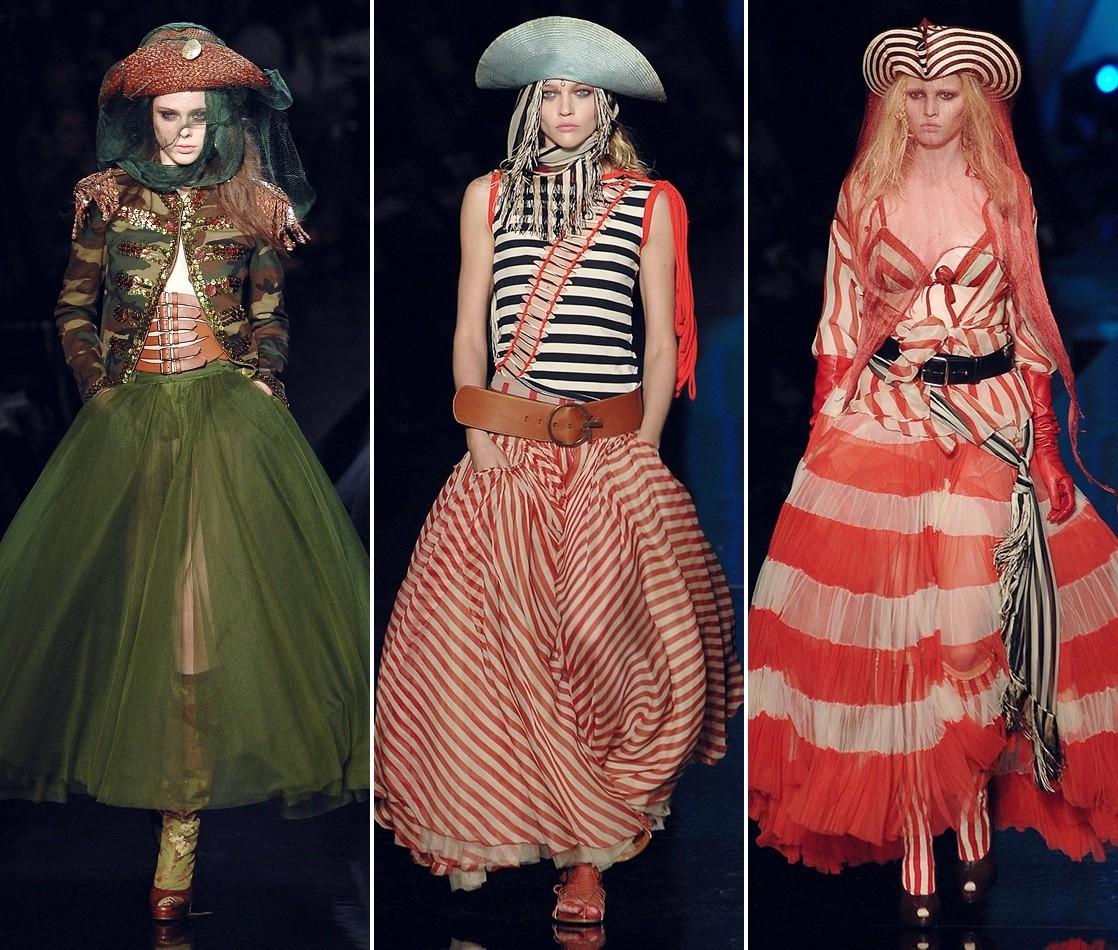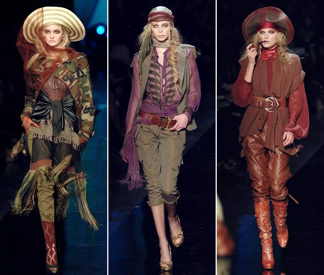 看似披披挂挂破破烂烂的衣衫有很多是来自军装感的迷彩服,“海盗”的主题让Gaultier拿手的层叠style发挥得酣畅淋漓~