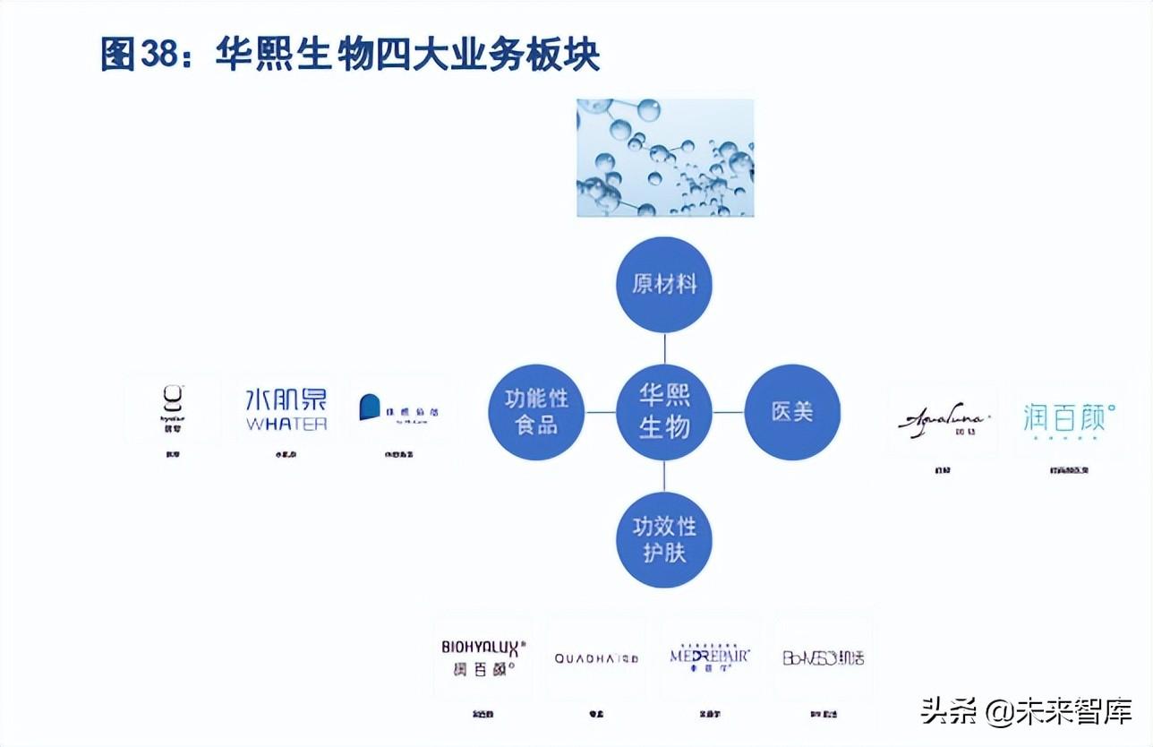 华熙生物:玻尿酸全产业链龙头,强技术力为医美产品布局提供支撑。华熙生物围绕玻尿酸进行上游原材料 和中游医美、功护肤、功能性食品等多应用场景进行布局。深耕玻尿酸领域多年,公司在发酵法菌 种培育、分子量控制、分子交联等领域形成强大的技术实力,成熟的酶切技术使玻尿酸小分子量达到双糖 级别,梯度 3D 交联技术、HEC 高交联专利技术可生产单相/双相、不同交联度的玻尿酸注射产品。近年来公司在 医美业务上积极推新,在传统润百颜、润致填充产品基础上,推出御龄双子针定位静态纹适应症,推出娃娃针定 位市场,未来有望受益于差异化细分市场发展以及Ⅲ类医疗器械合规化趋势,实现医美业务的增 长。此外,公司原料业务板块稳中向好,2020 年玻尿酸原料市占率达 43%;功护肤板块快速发展, 润百颜、夸迪、米蓓尔、肌活等品牌矩阵化发展,大单品持续放量,收入端保持高速增长;功能性食品积极 探索,长期空间广阔。整体来看,四轮驱动下华熙生物长期发展可期。