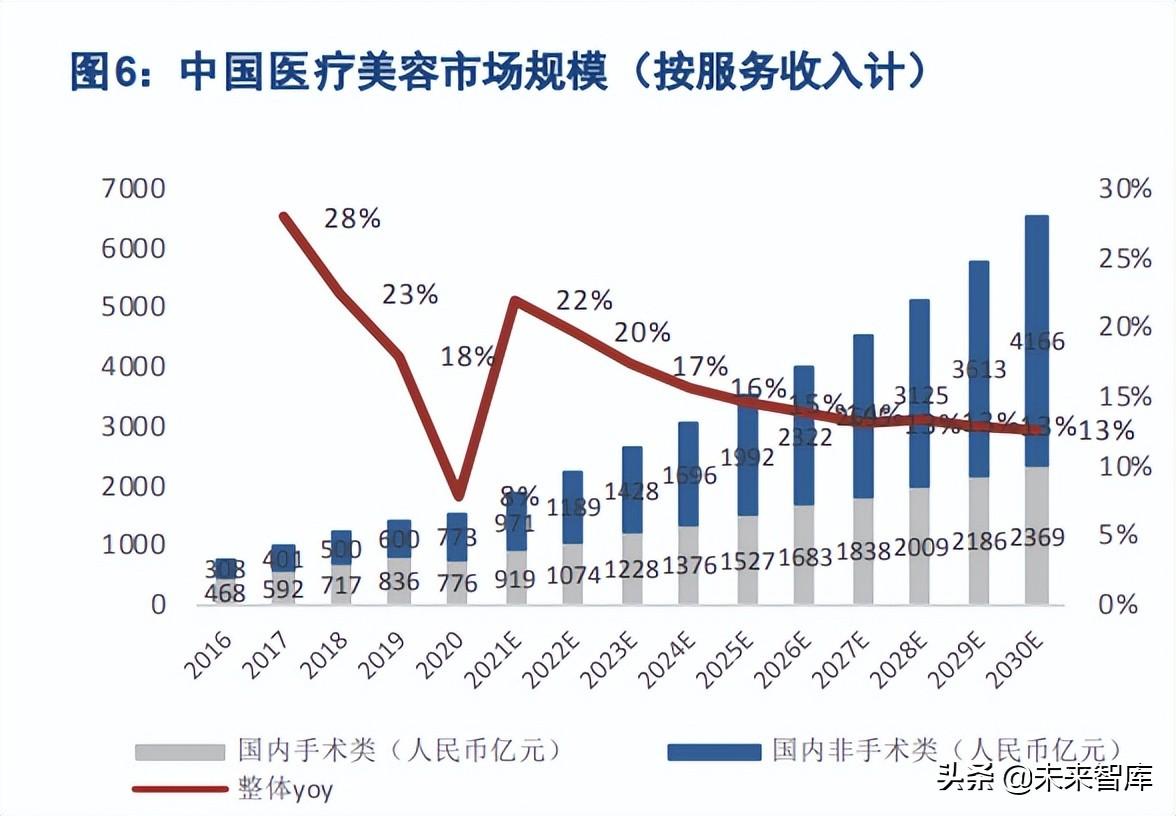 立足黄金赛道,我国医美市场持续快速扩容,增速高于平均水平。根据弗若斯特沙利文报告,按服务收 入计,2016-2020 年我国医美市场规模自人民币 776 亿元增至人民币 1549 亿元,CAGR4 达 18.9%(vs 全 球 2.2%);预计 2030 年将达到人民币 6535 亿元,CAGR10 达到 15.5%(vs 11.1%)。整体来看,若 剔除 2020 年疫情影响,医美市场经过多年发展,规模增速仍保持约 10%的较高水平,进一步验证医美 市场长期空间广阔。而我国在技术进步、颜值经济崛起、渗透率提升背景下,医美市场规模则有望以 15-20% 的更高增速扩容,是增速快的市场之一。