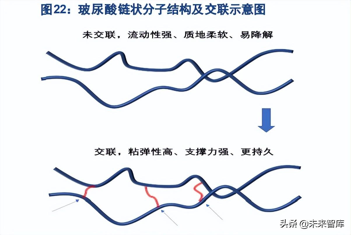 玻尿酸:是一种链状结构的多糖,不同分子量和交联度可以呈现不同的性状,满足不同的医美诉求,由 于分子结构相对简单,当前玻尿酸的分子量控制和交联度控制技术已较为成熟。从制备方法看,玻尿酸 分子可由动物组织提取或人工微生物发酵合成,其中微生物发酵法不受动物组织来源限制,产量提高、 成本更低,且相关的菌株培养、发酵过程监控、杂质代谢等技术已较为成熟,人工微生物发酵玻尿酸的 分子结构和功与动物提取法无差异,使得微生物发酵法成为主流生产方式,且微生物发酵法的成熟也 成为带动玻尿酸应用产品丰富与市场扩容的重要因素。