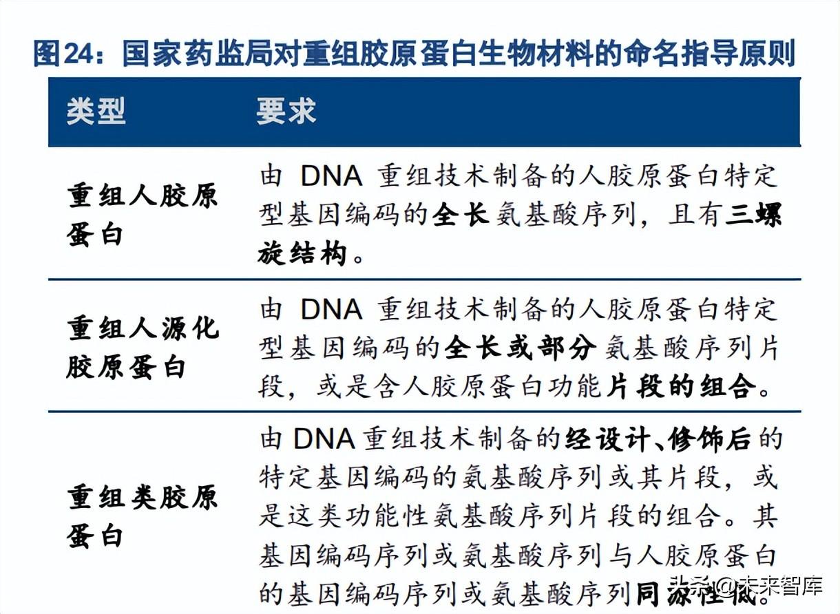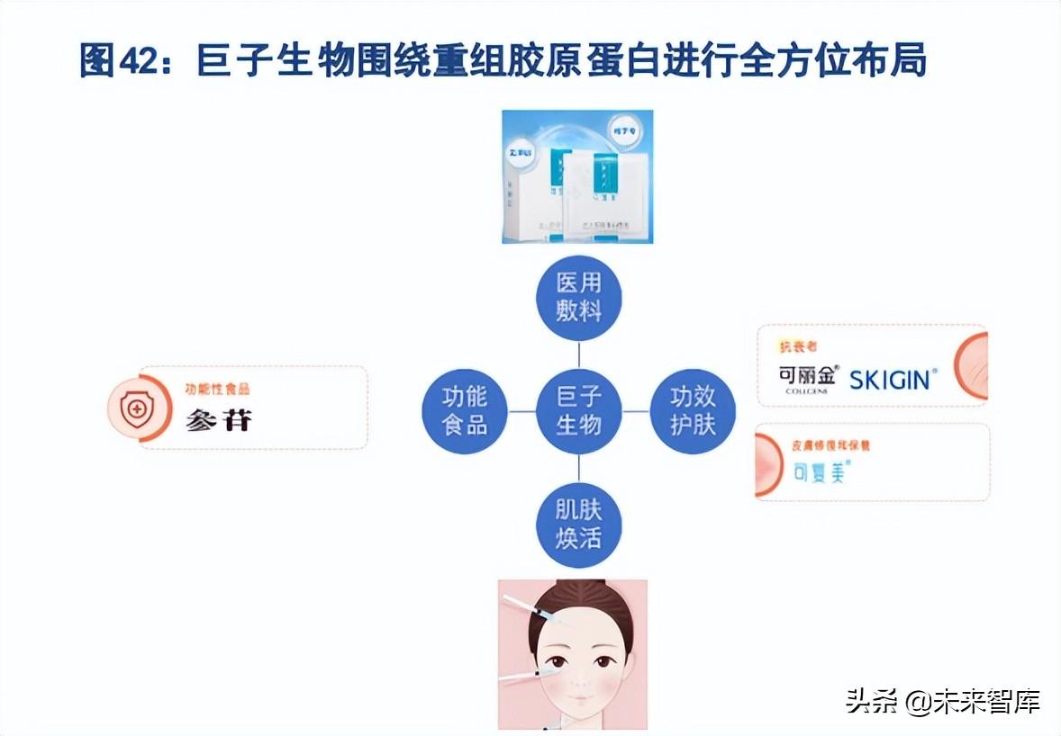 胶原蛋白:是一类高分子蛋白质家族,包括多种类型,每种类型的蛋白质分子都有其特定的基因编码, 对应不同的氨基酸组成和排列方式,并由此就决定了胶原蛋白不同的空间结构和功能。从制备方法看, 胶原蛋白过去只能从动物组织中提取,随着基因工程技术进步目前也可以通过人的基因片段重组表达实 现规模化、低成本生产,且我国的胶原蛋白重组技术已处于领先水平并持续快速发展。由于胶原蛋 白种类多、分子结构复杂,人工重组生产的技术难度较大,尤其作为医美填充材料的胶原蛋白,需要更 低的致敏性及更高的生物活性和支撑性,因此需要做到与人胶原蛋白链氨基酸序列一致,并且要由三条 α-肽链构成特定的三螺旋空间结构,这对相关公司的重组技术提出了更高要求。锦波生物旗下重组人源 化胶原蛋白填充剂“薇旖美”,其氨基酸序列的重复单元与人胶原蛋白氨基酸序列特定功能区相同,且功 能区域具有 164.88°柔性三螺旋结构,2021 年成功获批为 III 类医疗器械,标志着重组胶原蛋白在医美 领域的应用技术取得突破性进展;巨子生物已构建起重组胶原蛋白分子库,包含 3 种全长重组胶原蛋白, 即 Ι 型、Ⅱ型及 III 型重组类人胶原蛋白,25 种功能强化型重组胶原蛋白和 5 种重组胶原蛋白功片段, 其中全长重组胶原蛋白可以做到与人胶原蛋白链氨基酸序列完全一致。我们认为,随着基因工程技术快 速发展,叠加胶原蛋白巨大的潜在应用市场驱动,相关企业有充足的动力积极推进重组胶原的技术升级 和相关产品的商业化开发,未来重组胶原蛋白的功,尤其是生物活性和支撑性方面,有望逐渐提升甚 至达到与天然胶原蛋白趋同的水平。