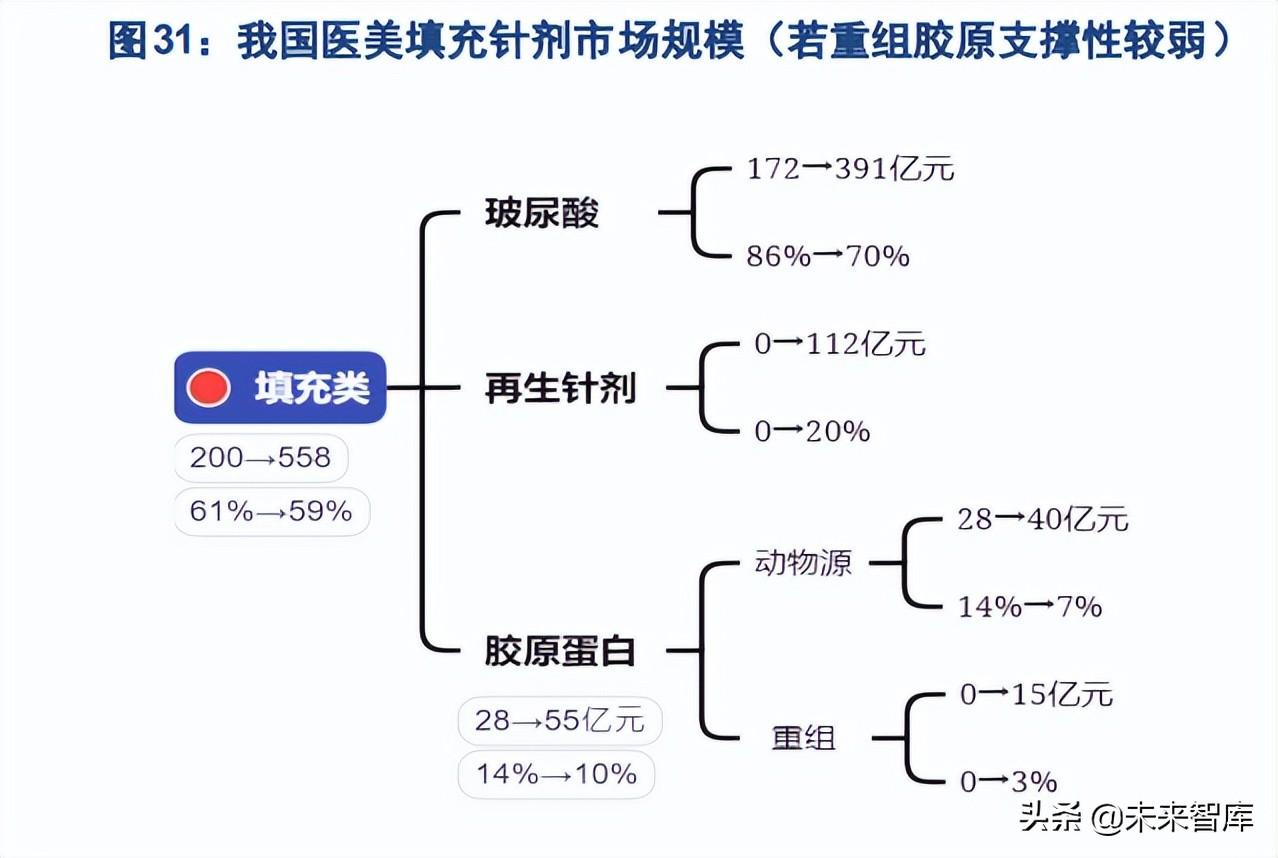 重组胶原蛋白:在支撑性得到验证之前,在终端作为填充剂的使用场景有限,或主要用于肤质改良性需 求,如水光类项目,对原有填充针剂市场的挤出应不强。若空间结构技术突破,支撑性得到验证,则 重组胶原在填充自然度与动物胶原趋同的基础上,还突破了动物胶原的致敏性和量产性局限,产能提升、 价格下行,将对动物胶原形成大幅挤出和替代;进一步地,由于兼具、自然、价格优势,还有望进 一步挤占玻尿酸市场份额,考虑到玻尿酸制备技术门槛更低售价更低、完善的分子量控制技术和交联技 术下长性和塑形力更好,相比之下重组胶原将主要吸引消费水平中上、追求自然与时的平衡、解决 动态皮薄适应症的求美者,对应中小分子、中低交联度、定位细分适应症、中高端价格带的玻尿酸产品。 基于以上分析,我们认为,若重组胶原支撑性得到验证,则重组胶原蛋白填充剂占填充针剂市场份额有 望达到 18%,对应终端销售额约 100 亿。