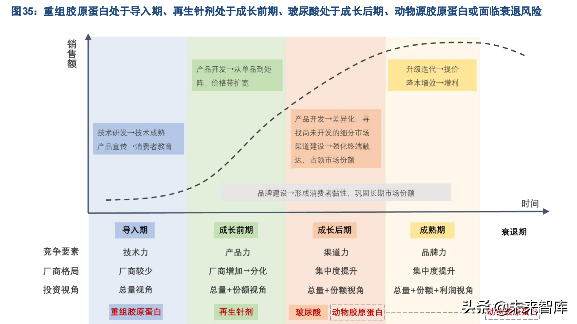 结合各材料的生产技术和产品特点,我们认为,当前我国重组胶原蛋白产品处于导入期、再生针剂处于成长 前期、玻尿酸产品处于成长后期、动物源胶原蛋白产品本身处于成长期,但未来可能面临一定衰退风险。玻 尿酸:处于成长后期,看好差异化适应症的细分市场快速增长,以及品牌应下头部厂商集中度提升;再生 针剂:处于成长前期,看好市场整体扩容放量,以及产品销售表现或将逐渐分化,功好、渠道强、培训广 的产品有望率先占领消费者心智和市场份额;重组胶原蛋白:处于导入期,支撑性的验证将成为重组胶原填 充剂由导入期进入成长期,实现快速扩容放量的拐点,关注相关厂商在关键领域的技术突破,在研产品的审 批进展,以及已获批产品的终端市场果反馈。动物源胶原蛋白:本身处于成长阶段,产能限制下关注现有 产能释放和新建产能落地进展,未来若技术改进下,重组胶原支撑性与动物源趋同,则可能被重组胶原挤出 进入衰退阶段,届时需关注仅在动物源胶原蛋白领域进行单一布局的厂商的销售下滑风险。