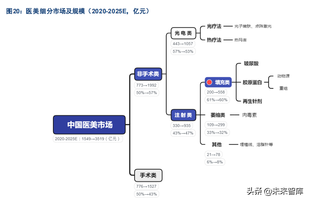 非手术类医美可以进一步划分为注射和光电类,光电类通过特定波长光能刺激皮下组织破坏和新生,注射类 通过针剂材料实现填充或萎缩,不同调节手段各有功特点,匹配不同求美者需求,均呈现出一定发展潜力。 考虑到针剂产品较光电设备的初始投资更低,现金流更稳定;且我国填充针剂产品的国产化率更高,本土厂 商的产品布局更多、研发推新更活跃,本文先行聚焦医美填充针剂市场,并将在后续系列报告中对其他细分 市场进行分析。医美行业技术升级和产品迭代较快,基于目前的材料制备技术及相关产品,我们认为 2025 年高增长的确定性高,各个细分市场的展望更为清晰,因此我们对 2025 年各细分市场的规模和格局进行展 望。
