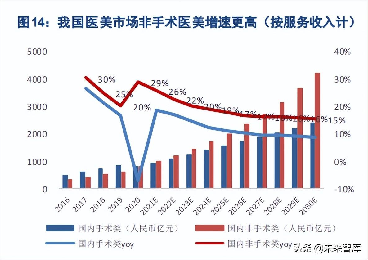 强劲需求叠加高商业模式,国内外医美市场中,非手术类医美均呈现出更强大的增长潜力和更高的规模增 速,占比逐渐扩大。根据弗若斯特沙利文数据,按服务收入计,市场看,2020 年非手术类/手术类 医美市场规模分别为 261/994 亿元,非手术类医美占比 20.8%;2030 年非手术类/手术类医美市场规模预计分别达到 1529/2075 亿元,CAGR10 分别为 19.3%/7.6%,非手术类医美增速更高,规模占比也将扩大 至 42.4%。我国市场看,2020 年我国非手术类/手术类医美市场规模分别为 773/776 亿元,非手术类医美占 比 49.9%;2030 年我国非手术类/手术类医美市场规模预计分别达到 4166/2369 亿元,CAGR10 分别为 18.3%/11.8%,非手术类医美增速更高,规模占比也将扩大至 63.7%。