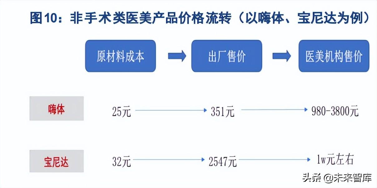 从竞争壁垒及产业链议价能力看,非手术类医美涉及的针剂、设备必须通过医疗器械审批,这使得中游 厂商具有更强的审批壁垒,从而在利润分配中获得更多主动权。从产业链视角看,医美产业链可划分为 上游原材料供应商、中游药物及器械生产商及下游医美服务机构,不同环节的竞争壁垒将影响产业链的 利润分配。对手术类医美来说,影响手术果的核心壁垒掌握在分散的医生个体手中,机构端控制力被 削弱,议价能力和利益分配中更为被动;对非手术类医美来说,针剂和设备的品质特点将影响调节果, 针剂和设备的研发和审批壁垒掌握在中游生产厂商中,使其在产业链利润分配中获得更多主动权。以嗨 体和宝尼达为例,原材料生产环节的毛利率可达 70%-80%,产品生产商的毛利率达 85%-95%,同时也 能给医美服务机构留有一定的利润率。