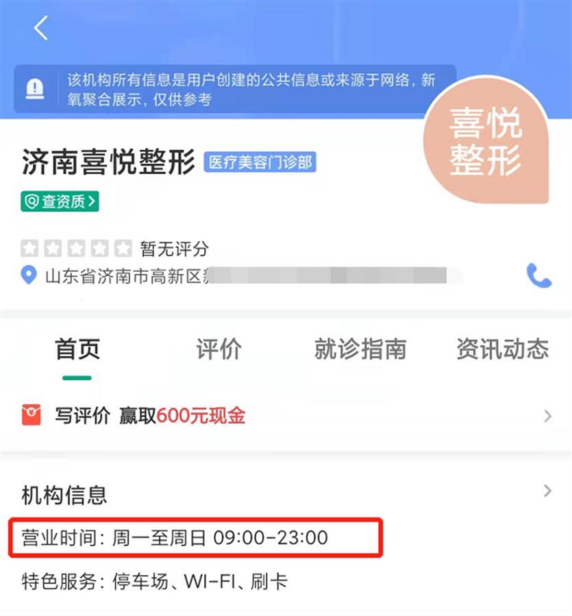 9月8日7时40分左右,极目新闻记者来到网传事发地济南市高新区喜悦整形医院。这是一家规模不是很大的整形机构,只有两层楼高,外部的装修看起来比较简约。记者一直等到上午10时09分,该店大门仍然紧闭,双层窗帘全部拉上,几乎什么都看不见。期间记者多次敲门,并无人回应。记者通过一医美服务平台查询到,济南喜悦整形医院在该平台显示的营业时间为周一至周日9点到23点。