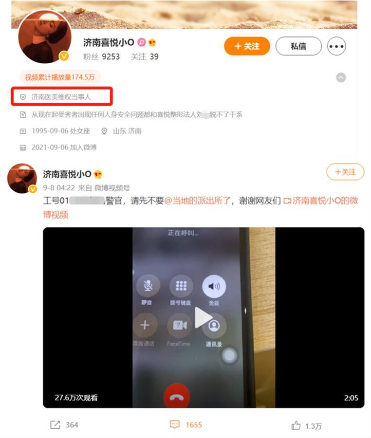 9月8日凌晨4时22分,微博认证为“济南医美维权当事人”的微博号“济南喜悦小O”发布了一段与当地派出所民警通话的视频。视频中民警称时间紧急,让当事人到派出所了解情况,但该当事人称太晚了,想第二天再到派出所接受询问,随即挂断了电话。