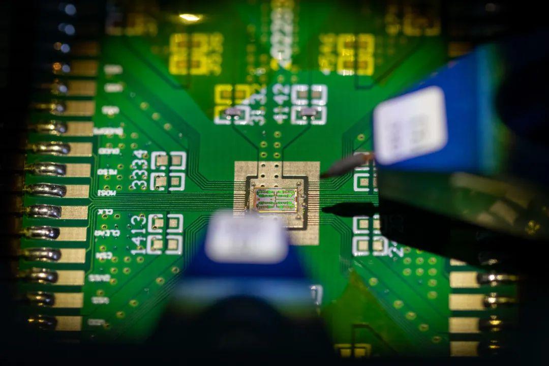 中国电科38所科研人员在微波探针台上测试微芯片性能。