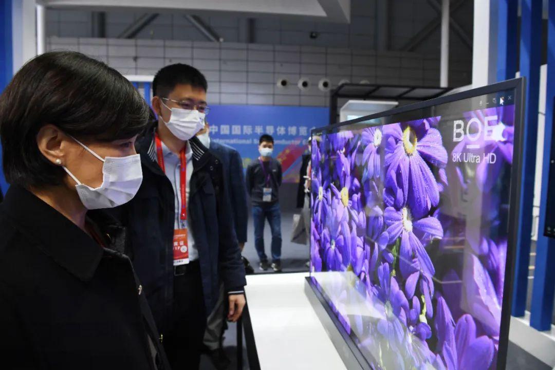 11月17日,在第二十届中国国际半导体博览会现场,市民在观看京东方透明电视展品。
