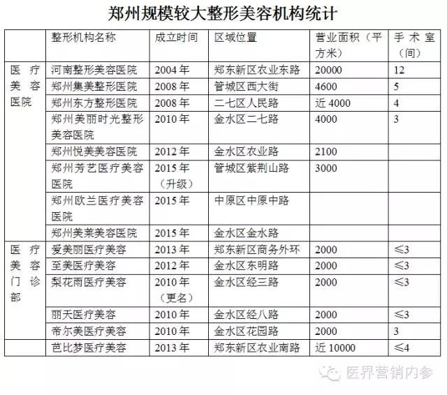 在8家整形医院打头的情况下,郑州市场拥有不少于60家医疗美容门诊部,以及超过100家医疗美容诊所。