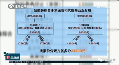 手术如果终成交,代理商和医美机构之间就按照事先约定好的比例分成。手术当天就结账给返点,一般来说,参与分成的钱,就是客户做完整形手术后总费用扣除全麻费、术前体检费、住院费和输液费等余下的部分。如果整形手术中需要植入假体,假体的费用也不算在分成范围之内。