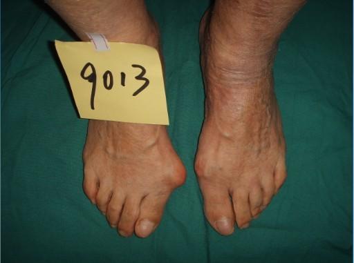 由于其余四趾在以前遭到外翻的第一拇趾的长期挤压,其另外四趾也会向外侧偏斜。