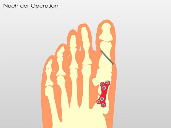 德国人做大脚骨采用坚强内固定,下图是德国大脚骨手术后的示意图:坚强内固定,采用微型钢板,可吸收螺钉等把截骨两端绑定。