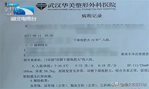 回想这手术后的情形,李女士至今都惊魂未定。她告诉记者:“我是想让我自己脸型变得更加一些,就想下颌骨,脸型能更“V”一些,选择了武汉华美整形医院,去做一个下颌骨截骨手术,一般这个手术的话大概就是2万多块钱、3万块钱左右。”