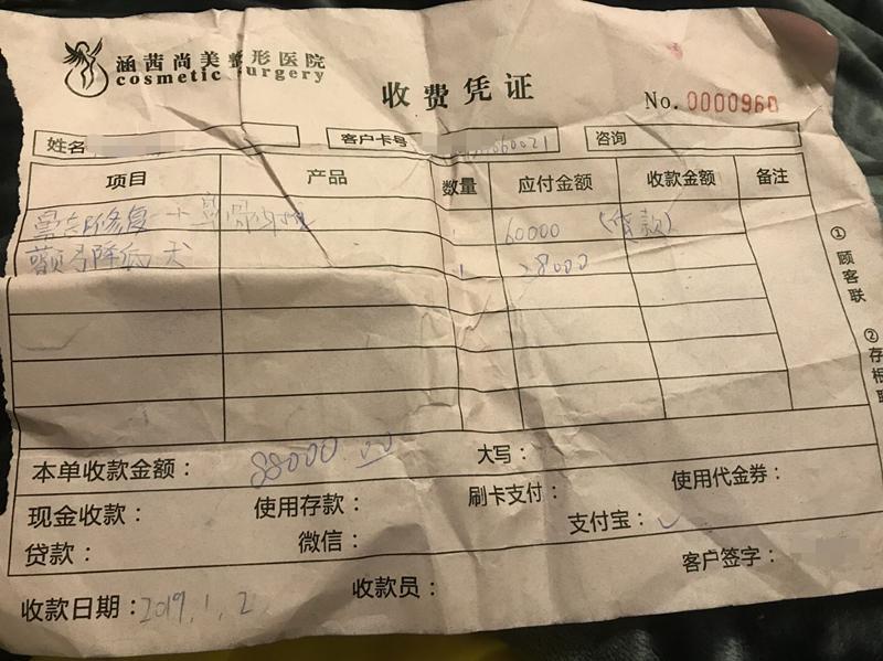 小美告知中新经纬客户端,上述整容费用合计逾11万元,均通过支付宝和微信对盛某个人进行的转账,第二次的手术费除了转账的2.8万,还有在盛某推荐下用网贷平台的6万元,而所有的费用均没有开具发票,后期再去追问美容公司时,却得到了“我们从来不盖章”的答复。现在,小美不但无法上班失去收入来源,每月还要还高额的网贷利息。