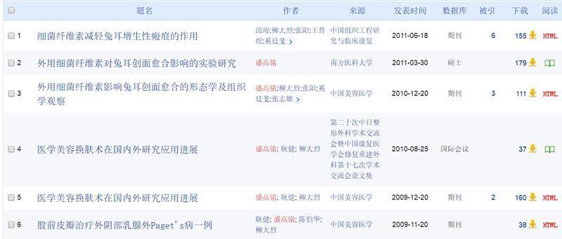 中新经纬记者在盛某的个人简介中看到,其自称毕业于南方医科大学(原中国人民解放军第一军事医科大学)整形美容外科专业,医学博士(PHD),临床医学美容系科班出身,发表中外论文十余篇。然而,在中国知网查询后只看到6篇与盛某有关的论文,时间跨度在2009-2011年三年间,且只标注是硕士论文,并未见到博士论文。同时,中新经纬记者在南方医科大学博士招生网站看到,在近年的博士招生目录中,也并未有“美容系”或“整形美容专业”,仅有的类似专业也只是外科学专业的整形方向。