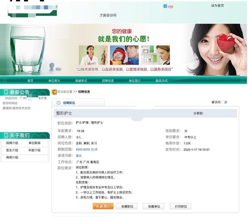 中新经纬客户端通过卫健委医生执业注册信息查询后发现,盛某并未在广州盛某医疗美容诊所持有执业医生证书。而在这家诊所的官网上,却依旧介绍自己为微整机构,并在招聘整形护士。