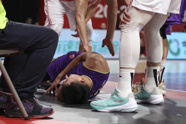 比赛后1分30秒,回追的孙悦助跑、起跳、盖帽——他将青岛外援亚当斯的快攻扇出了底线,可落地时却踩到后者的小腿扭伤脚踝……倒下的孙悦捂着脚踝好一阵子。
