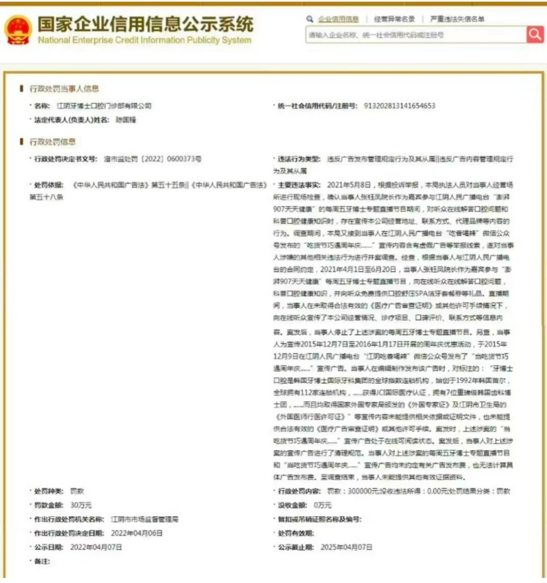2022年4月,江阴牙博士因违反广告发布管理规定行为,被江阴市市场监管总局没收30万违法所得。